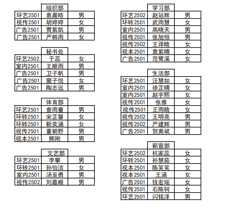 | 传媒与艺术设计学院2025级分团委学生会新成员名单公示 | |||