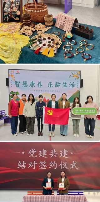 10月27日上午,重阳佳节来临之际,传媒与艺术设计学院党总支副书记李宁宁、辅导员颜晓莺带领学生志愿者团队,赴刘潭新村社区参加“智慧康养乐龄生活”2025年重阳节暨敬老月创新嘉年华活动。活动现场,学院党总支与刘潭新村社区党委正式签署党建联建结对协议,标志着校地党组织构建“组织链、资源链、服务链、项目链、发展链”五链融合的联建新格局全面启动。根据协议,学院党总支将依托专业优势,推动“银龄课堂”传统文化技能培训与社区公共空间改造等服务常态化、精准化落地,实现高校党建资源有效下沉。 在嘉年华活动现场的展示体验区,传媒与艺术设计学院党总支师生带来的非遗技艺与文创展示成为全场焦点。中药手作、螺钿镶嵌、竹编饰品等展台前围满了社区居民,学生党员和志愿者们不仅展示作品,更耐心讲解工艺,并邀请长者互动体验,在实践传承中弘扬敬老文化,彰显党组织引领下青年服务社区、凝聚群众的良好风貌。 此次活动是传媒与艺术设计学院党总支深入推进“双先五链”联建机制,聚焦“创新链”、优化“教育链”,服务基层治理的务实举措。今后,学院党总支将继续以党建为引领,拓展“银龄课堂”内容与形式,组织党员师生深度参与社区微更新项目,通过艺术设计赋能基层治理,构建智慧宜居社区,为实现“老有所养、老有所乐”注入党组织红色动能。