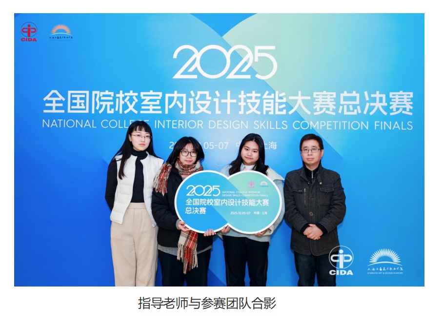 12月5日至7日在上海工艺美术职业学院承办的2025年全国院校室内设计技能大赛总决赛中,我校刘洁莹、单磊教师指导的学生蔡永净、包婧雯,斩获高职组一等奖。 该赛事由中国室内装饰协会联合教育部职业院校艺术设计类专业教学指导委员会主办,是室内设计教育领域极具影响力的国家级赛事,分为中职组、高职组和本科组三个组别,赛题以真实行业需求为导向,参赛团队需在6个多小时的紧张赛程中,根据任务书要求完成手绘、建模、渲染、排版等多项任务,全面考验学生的综合设计与表达能力与协作能力。并且在赛事中前瞻的融入了人工智能(AI)技术应用环节,要求选手使用AI工具对效果图进行深化处理,充分展示了参赛学生的数字化设计能力。 赛前学院高度重视备赛工作,指导团队围绕大赛主题,经过长期系统化集训,打磨设计方案、精进实操技能。参赛团队承受住了极大压力,从省赛到国赛奋勇拼搏,经历层层选拔,脱颖而出,取得全国前十。 该项赛事的获奖体现了我校环境艺术设计专业、室内艺术设计专业教学对接室内装饰设计行业标准和产业需求,真实反应专业教育教学水平,也体现了我校深化“以赛促教、以赛促学”理念的重要实践成果。近年来传媒与艺术设计学院持续创新与发展,通过实践推动整体教学内容和方法的改革与创新,有效促进教育链、人才链与产业链的有机衔接,为无锡地方室内设计行业的高质量发展持续输送新生力量。