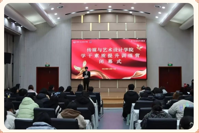 为深入贯彻落实立德树人根本任务,全面提升学生骨干的综合素养与履职能力,2025年12月17日,传媒与艺术设计学院2025年度学干素质提升训练营结业仪式暨表彰大会在学院小报告厅隆重举行。学院党总支书记夏心怡、副书记李宁宁、分团委书记张可嘉及辅导员代表出席活动,与全体学员共同回顾成长历程,见证丰硕成果。